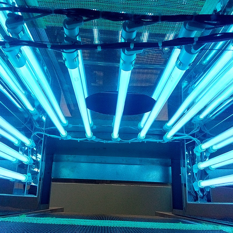 5、各組殺菌燈可單獨控制, 增加可調整 UV 燈管角度的調節(jié)裝置, 燈管總長589mm, 波長為 254.7mm, 殺菌率可以達到 95%)。裝有自動計時器, 可隨時監(jiān)控燈管的使用時間, 方便燈管的更換。如產(chǎn)品為可掉渣類, 可采用托盤放在輸送帶上殺菌?! ?/span>